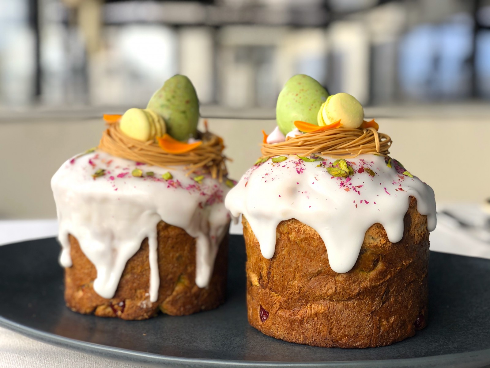 Зеленые куличи с турецкими фисташками — угощение для всех гостей 5 мая в ресторане Levantine. Кондитеры еще добавляют в тесто вишню — получается идеальный баланс вкуса (и красоты).