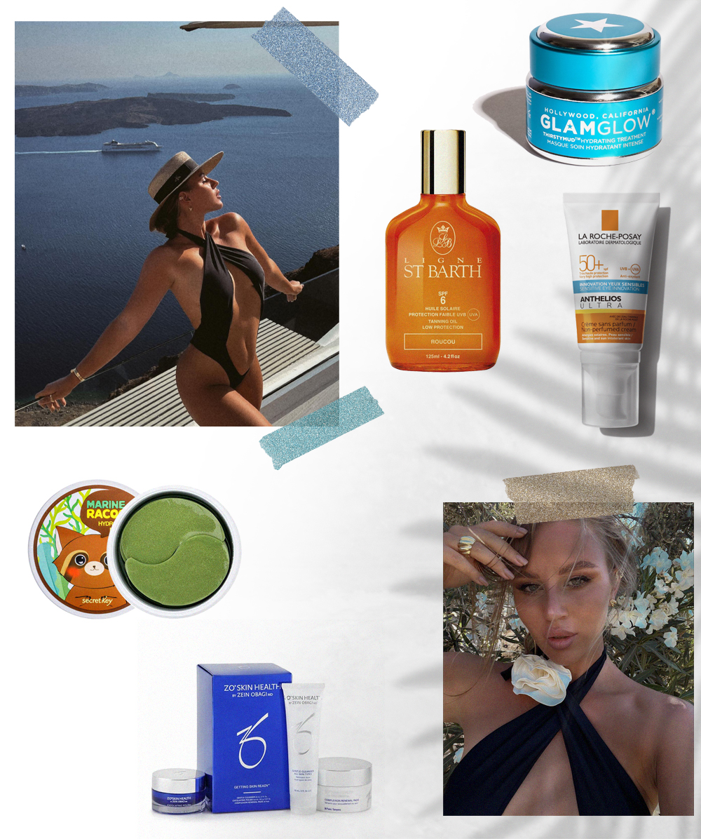 В моей косметичке для путешествий всегда есть средства для очищения. На Миконосе это было особенно необходимо — там много солнца, кожа постоянно потеет и на нее оседает пыль, особенно если ездить в кабриолете. Также косметика забивает поры. Сейчас я использую серию OBAGI для комбинированной кожи. Сначала наношу скраб Exfoliating Polish, который больше напоминает гель с гранулами. Он качественно очищает и скрабирует кожу, еще нравится его легкая и воздушная текстура. Также обязательно протираю лицо тоником, а в качестве завершающего штриха — увлажняющий крем. Кроме этого, один раз в неделю использую щадящий скраб для лица, который делает кожу чистой до «хруста». А после солнечных ванн делаю маски с алоэ вера, чтобы успокоить кожу.