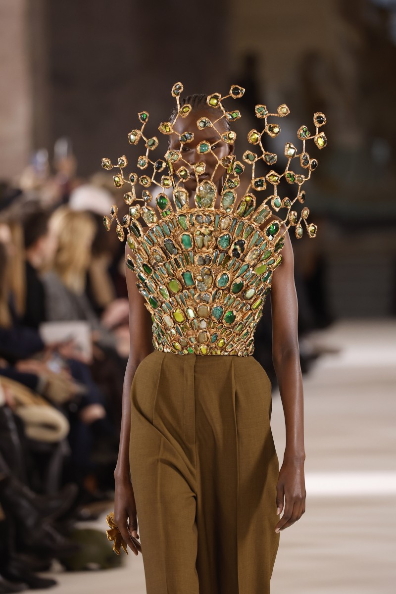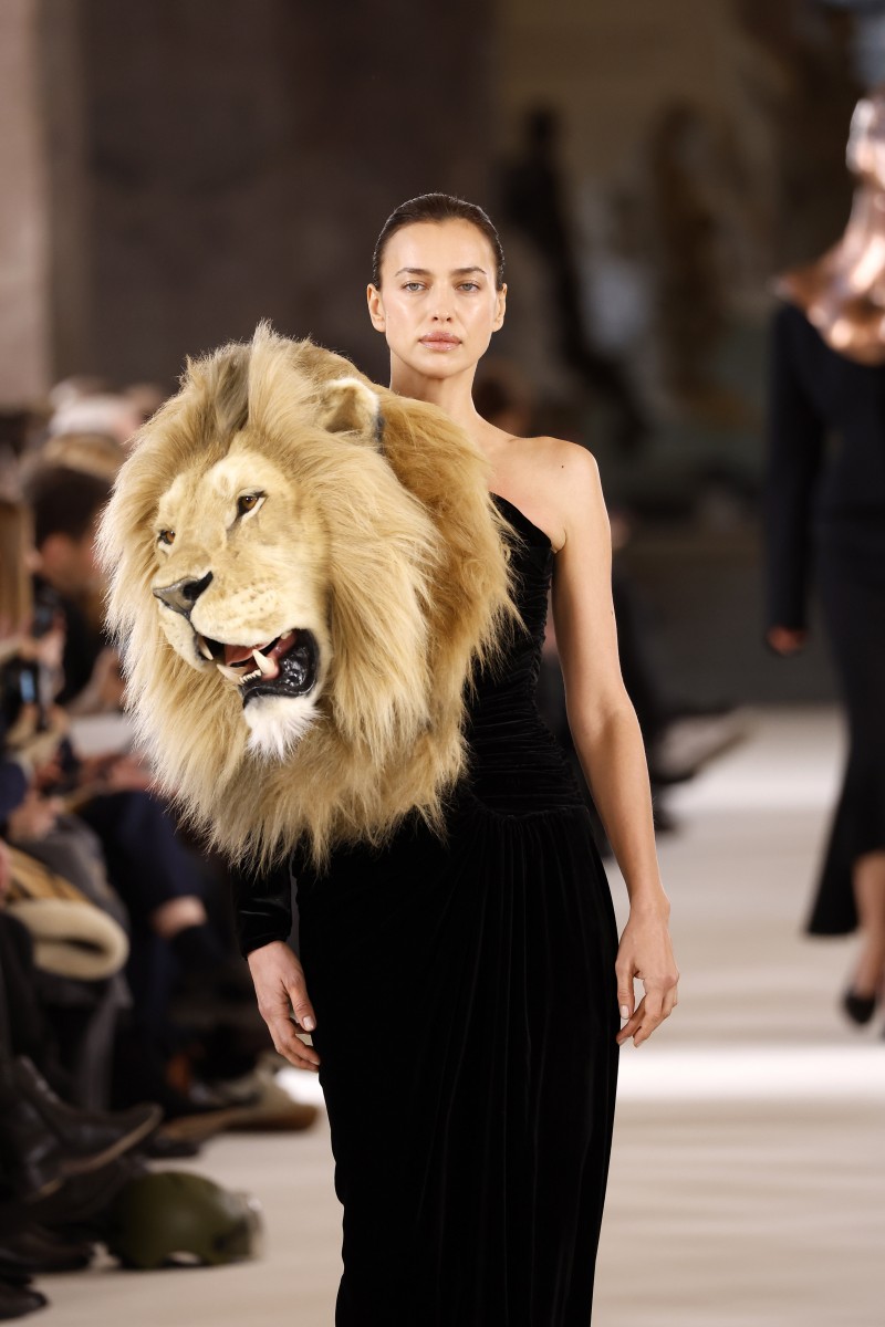Показ Schiaparelli на кутюрной Неделе моды в Париже и без того мог бы войти в историю. Например, благодаря эффектному топу в виде хвоста павлина из камней, который тут же захотели приобрести несколько гостей. Или огромной металлической маске, которую в шутку прозвали скафандром, — очереди на покупку не было, но зато обсуждали ее активно. Однако креативному директору бренда Дэниелу Розберри этого показалось мало. И главной изюминкой шоу стали три легенды мира моды в очень спорных нарядах. Наоми Кэмпбелл вышла на подиум в черной шубе с головой волка, Ирина Шейк и Шалом Харлоу — в платьях с головами льва и рыси.