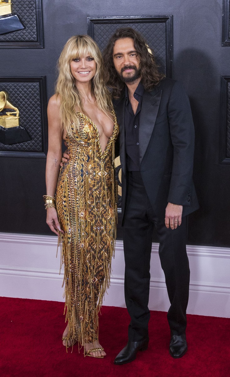 Хайди Клум пришла на церемонию с мужем Томом Каулицем. И стилисты подобрали для нее золотое платье с глубоким декольте The Blonds.