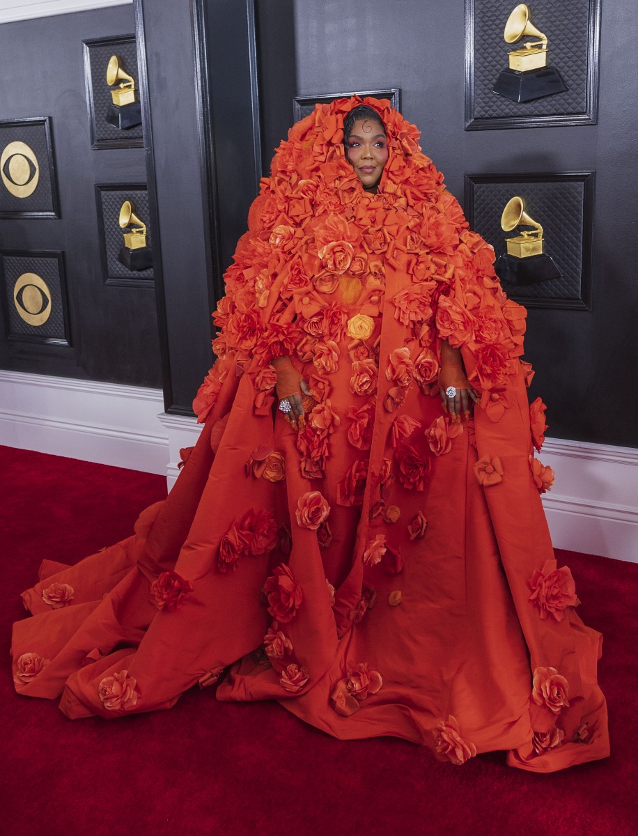 Самой экстравагантной персоной мероприятия стала Лиззо. Посмотрите ее наряд с красной накидкой Dolce & Gabbana. дополненный украшениями Messika!