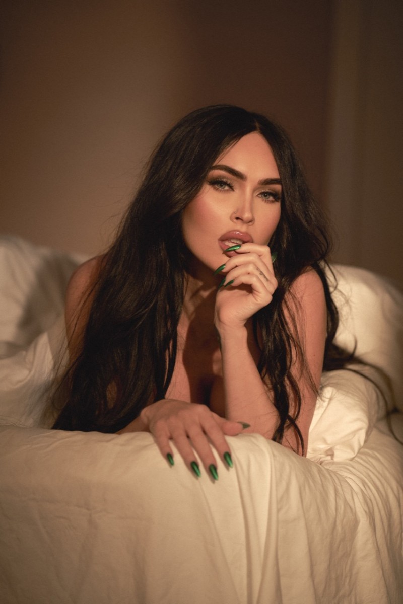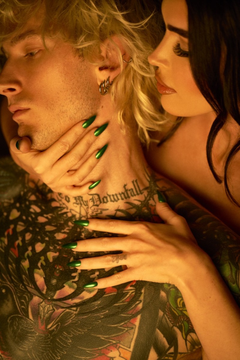 Помимо зеленого, в линейке представлены лаки в рубиново-красном и глубоком синем оттенке. Но больше всего впечатляет рекламная кампания. Меган, как всегда, выглядит очень сексуально. А на некоторых снимках вместе с ней позирует и MGK.