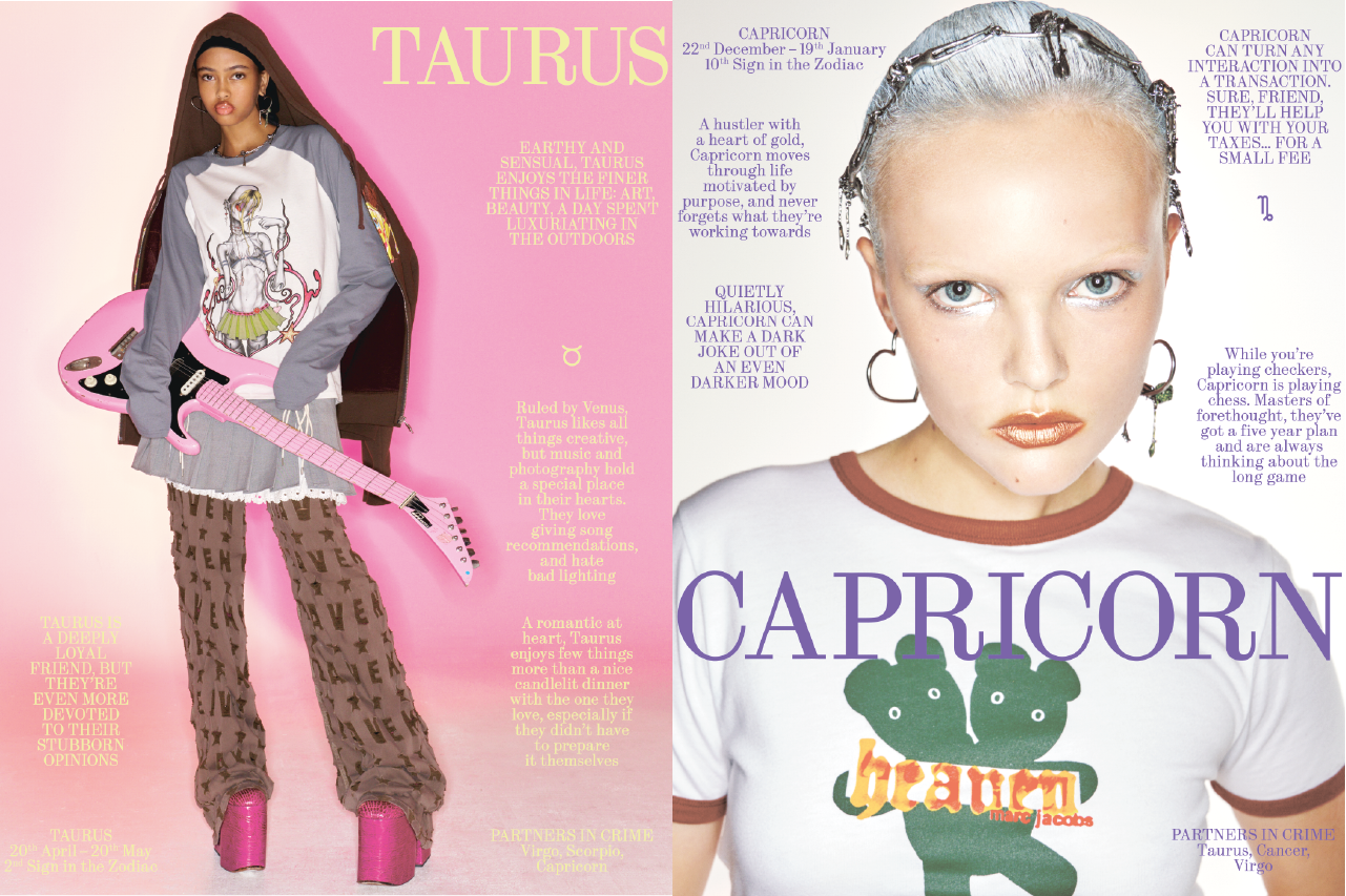 Не менее интересной оказалась идея рекламной кампании: лондонский фотограф Мерили Андре запечатлела моделей в образах, которые соответствуют определенному знаку зодиака. Овен, к примеру, представила рыжеволосая модель с веснушками в светлой короткой юбке, топе с открытыми плечами и черных сапогах. А Рак — девушка с длинными темными волосами в розовом вязаном костюме с плюшевым мишкой в руках. Зато представительница Рыб, по мнению дизайнера, красит глаза голубыми тенями и носит татуировки.