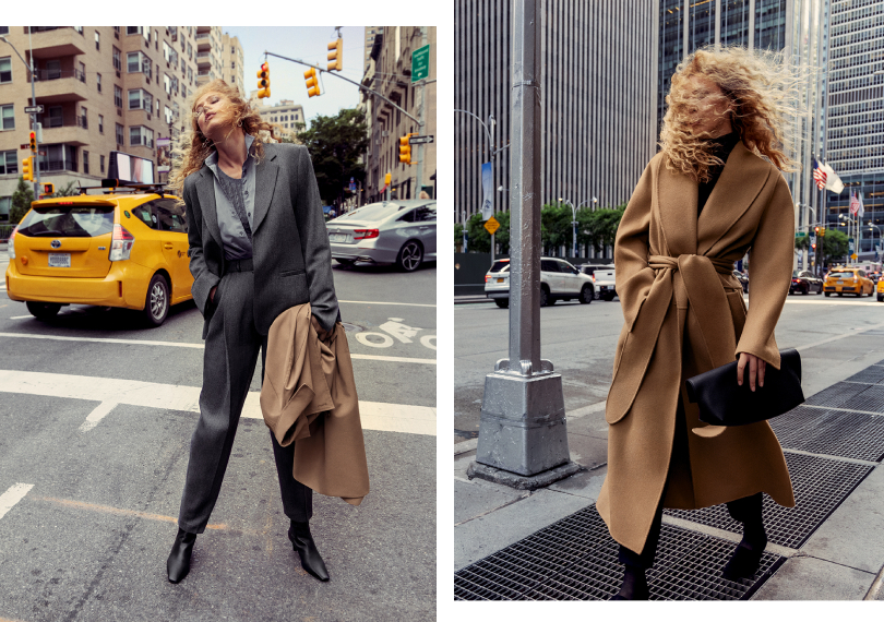 В коллекцию бренда вошли классические вещи: пальто-халат с поясом в оттенке camel, темно-серый брючный костюм, черное шерстяное пончо с капюшоном. Идеально для прогулок по городу и деловых переговоров.