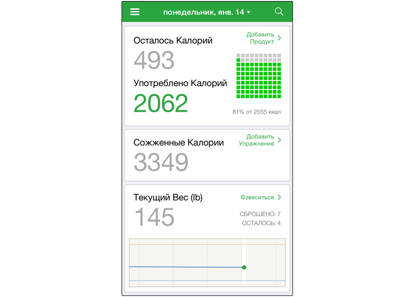 Внутри приложения много инструментов. Можно составить индивидуальный план питания и выставлять цели: потеря веса, его удержание, наращивание мышечной массы. Еще один виджет – таблица калорийности, в которой два миллиона продуктов, так что кумкват и дрэгон-фрукт точно найдете! Перед приемом пищи можно создать план, добавлять любимые продукты или вводить в базу новую еду. Кроме того, в приложении отслеживаются не только калории, углеводы, белки и жиры, но и занятия спортом.