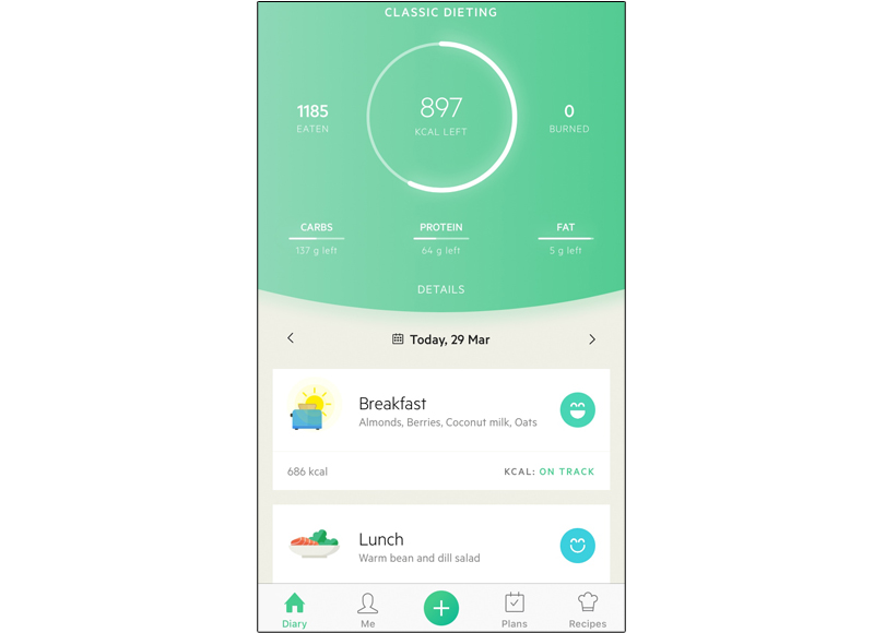 Приложение призывает не забывать вести дневники: пищевой, чтобы планировать и наблюдать за тем, что вы едите, и дневник упражнений – для записи всех сожженных калорий. Следить за изменением веса в таблице, отмечать цели и вести отчетность. В ленту можно фотографировать блюда и продукты, чтобы нагляднее помнить о пище, которую вы приготовили и съели.
