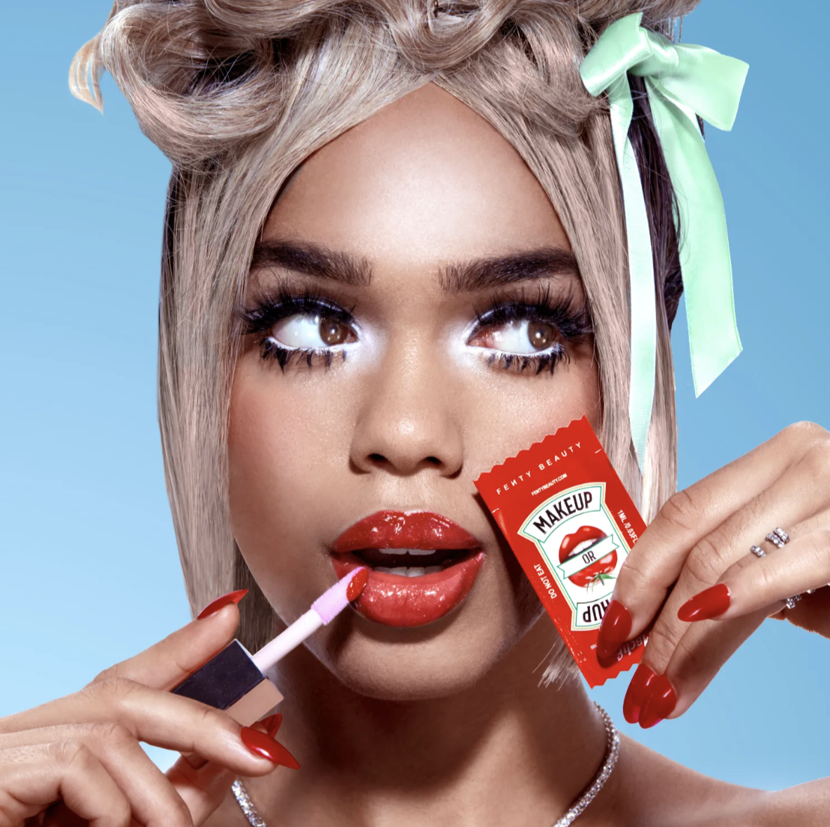 «Кетчуп или косметика»? Это новый слоган коллаборации бьюти-бренда Рианны Fenty Beauty с маркой MSCHF. Две компании представили набор с шестью совершенно идентичными упаковками кетчупа, но только в пяти будет соус. В одном из пакетов вы найдете сюрприз — блеск для губ Gloss Bomb вишневого оттенка. Согласитесь, очень забавно. Мы можем предположить, что новинка особенно понравится молодым девушкам и подросткам.