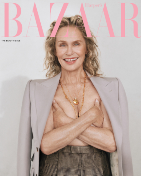 Лорен Хаттон начала карьеру модели в 60-х, а в 70-х уже снималась в кино. Ее самые известные проекты – контракт с косметической маркой Revlon и съемки в фильме «Американский жиголо» с Ричардом Гиром. Сегодня Лорен – 78, и она продолжает сниматься для рекламы и журналов. В том числе, топлес. И без удаления морщин фотошопом. Мы в полном восторге от ее съемки для американского Harper’s Bazaar! На обложке майского номера Хаттон позирует в светлом жакете Gucci на голое тело, прикрывая грудь руками.