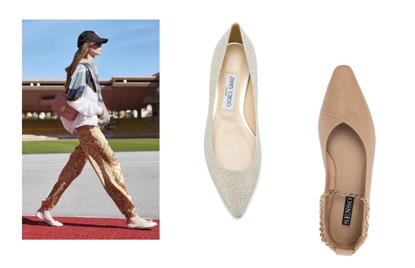 На выбор — множество вариантов. Балетки пастельных оттенков с круглым мысом и бантом из завязок для прогулок ищите у Celine и Zara, черные и бежевые с заостренным мысом для офисных будней — у Jimmy Choo, Valentino, Bottega Veneta и COS.