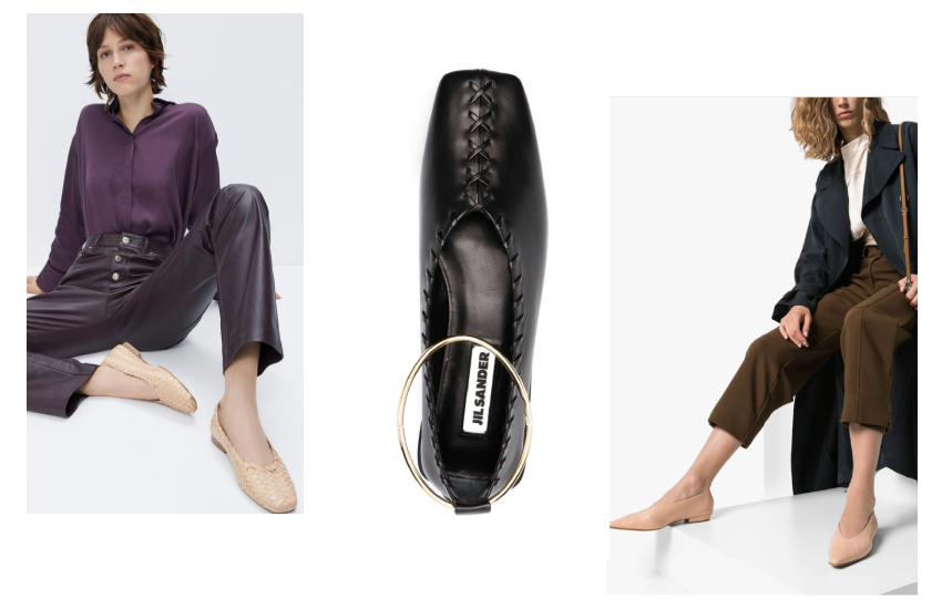 На фото слева направо: балетки Uterque, 11 590 руб., балетки Jil Sander, 36 639 руб., балетки Bottega Veneta, 38 975 руб.