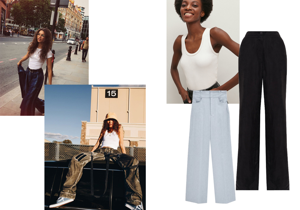 По часовой стрелке: топ молочного цвета 2Mood, 3 980 руб.; прямые брюки с резинкой Studio29, 5 900 руб.; широкие костюмные брюки Lime, 4 999 руб.
