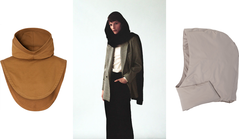 Cлева направо: капюшон в рубчик Burberry, 10 500 руб.; шарф из смесовой шерстяной пряжи с капюшоном Zara, 2 599 руб.; капюшон на магнитах Gate31, 3 490 руб.