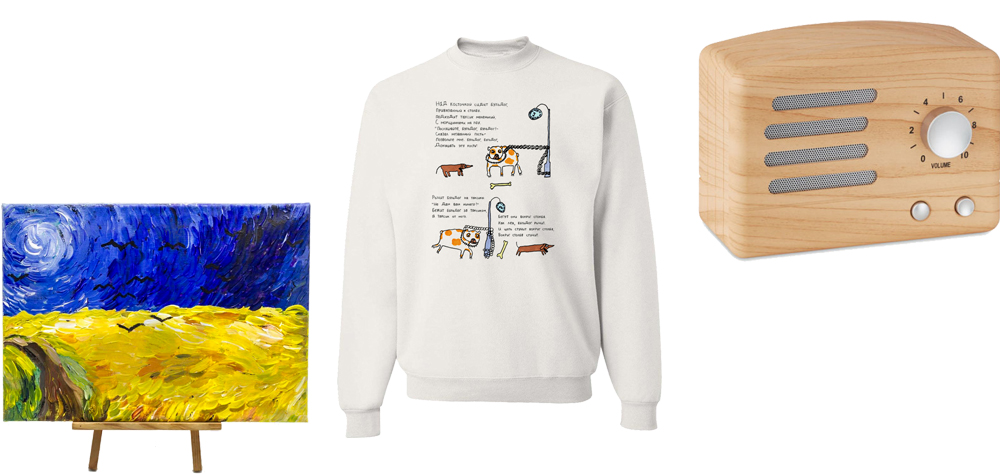 Свитшот «Бульдог и таксик» (2 300 руб.) можно купить в магазине «Наивно? Очень», где продают картины и вещи с рисунками людей с ограниченными возможностями. Иллюстрации на свитшоте нарисовал художник Дмитрий Кошенский, а стихи – авторства Даниила Хармса.