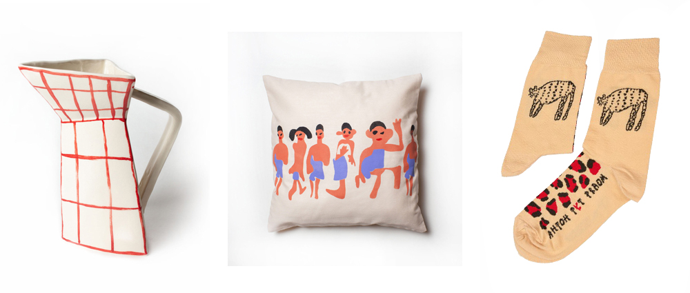 У нас в закладках: треугольный керамический кувшин (3 000 руб.), носки,выполненные по эскизам студентов Центра (350 руб.), и подушка «человечки» со съемным чехлом (950 руб.).