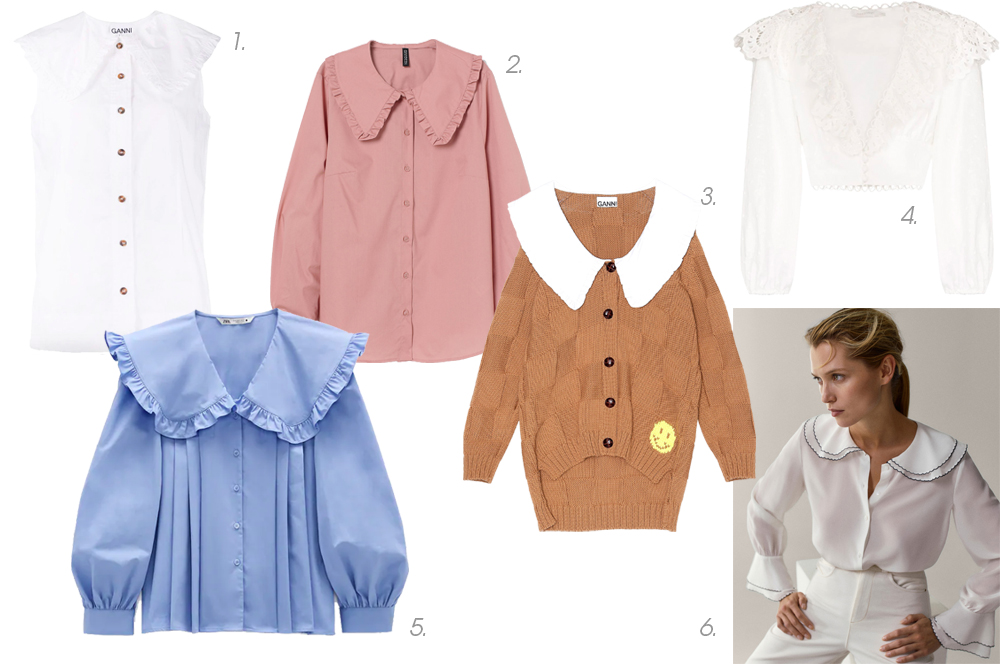 Эту деталь в западных СМИ назвали piligrim collar («воротник пилигрима») или Peter Pan collar (в честь сказочного героя, не хотевшего взрослеть и носившего костюм с полосой белого кружева). Сейчас в лентах стилистов и блогеров можно найти хотя бы по одному образу со школьным воротничком. Бренды категории middle и масс-маркет бодро подхватили тенденцию: в последней коллекции Ganni есть как минимум пять вещей с подобным аксессуаром, в Zara и H&M – блузки и платья из хлопка и поплина.