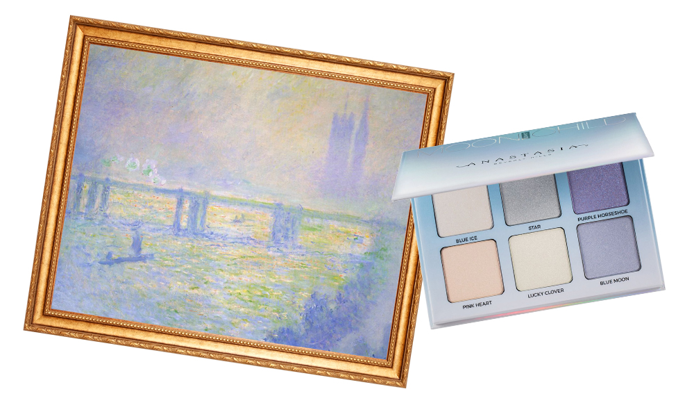 У французского художника-импрессиониста Клода Моне — серия работ с видом лондонского моста Чаринг-Кросс. Одна из картин в холодных сиренево-голубых оттенках с добавлением желтого была написана в 1899 году, а сейчас находится в музеи искусств Санта-Барбары. Добраться до музея из-за пандемии невозможно, но палетка теней Moonchild Glow Kit, Anastasia Beverly Hills поможет приблизиться к шедевру. По крайней мере, ее цветовая гамма очень напоминает ту, что использовал Моне еще (сложно поверить!) в XIX веке.