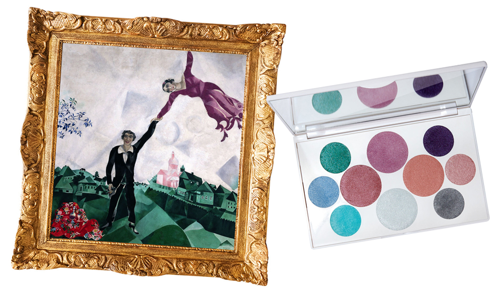 «Прогулка» 1918 года — одна из самых известных картин представителя русского авангарда XX века Марка Шагала. На ней он изобразил себя и летящую Беллу Розенфельд — первую жену и свою главную музу. Цветовая гамма очень насыщенная: преобладают как яркие зеленые и темные оттенки, так и нежные сиреневе, розовые и голубые тона. Палетка теней Mermaid Eye Palette, Crayola — как будто палитра великого мастера в то время.