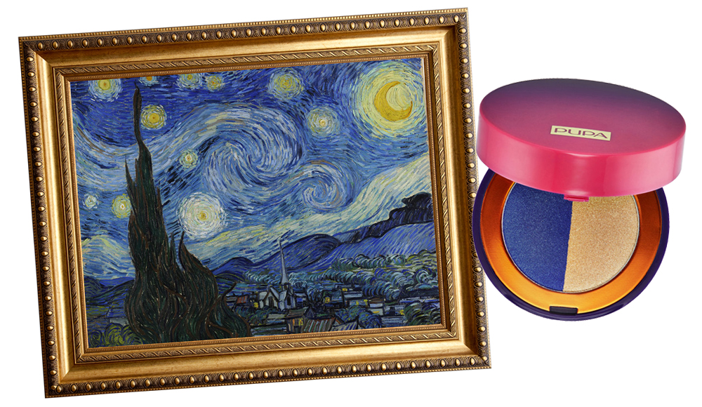 Картина «Звездная ночь» нидерландского художника-постимпрессиониста Винсента Ван Гога написана в 1889 году. На ней изображен вид из окна на предрассветное летнее небо и вымышленную деревню. Главные цвета — темно-синий индиго и золотисто-желтый. Мы нашли два этих оттенка в линейке Sunset Blooming Eyeshadow, Pupa.