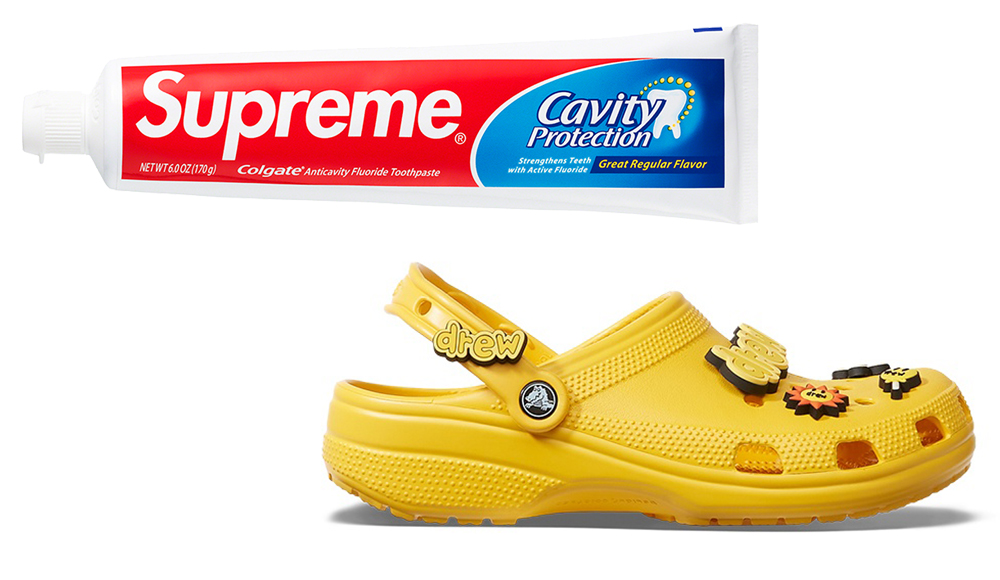 Сегодня на официальном сайте Supreme стартуют продажи нового дропа – на этот раз с Colgate. Стоимость тюбика пока неизвестна, но уже предполагают, что это будет самая дорогая отбеливающая зубная паста. А 13 октября Crocs выпускает совместную модель вместе с брендом Джастина Бибера Drew. Этому союзу уже пророчат успех – все, что имеет хотя бы косвенное отношение к Drew, раскупается за часы. Стоимость фирменных желтых кроксов будет $54,99.