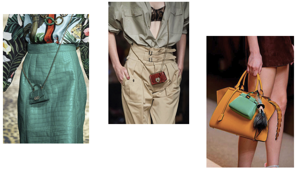 Присмотрись к микро-сумкам. Их можно носить вместе с основными дамскими сумками или сумками в стиле «шоппер», прикрепив как деталь. Если учесть цветовой акцент, то они дополнят образ и сыграют в твою пользу.
