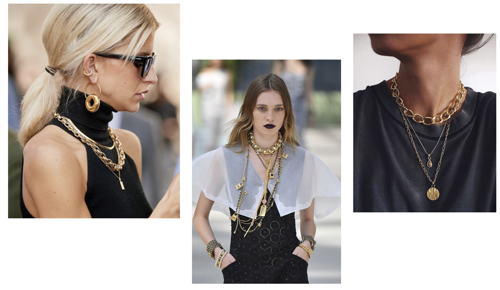 Можно смело надевать все самое большое и массивное. И при этом все сразу! Серьги, цепи, браслеты и броши. Цепей не может быть много. Крупные агрессивные цепи, разное плетение, разная длина, цветовое сочетание серебра с золотом — все будет смотреться стильно! Только имей ввиду, если образ сам по себе получается объемным, то и украшения должны быть крупными, и наоборот. И не стоит носить «бабушкины» комплекты — их время ушло. А вот современные броши можно использовать везде — на рукавах и воротниках блузки, на джинсах, на шляпах, россыпью и ассиметрично. Прикалывая их к одежде, ты сделаешь свой образ trandy. Брошь — это акцентное пятно, аксессуар, который сможет связать элементы одежды по цветам.